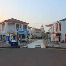 人口的な浜辺にヨーロピアンな建築物が建設されている。