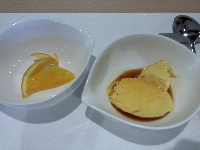 パンナコッタ?でしょうか。オレンジが同じ器に別途盛られていたので???