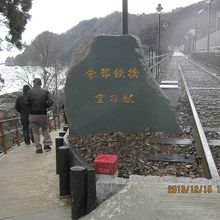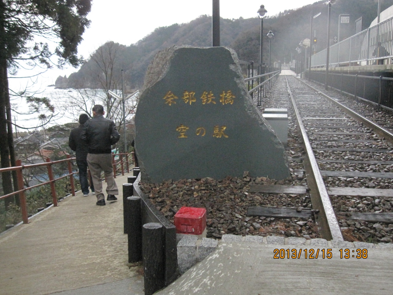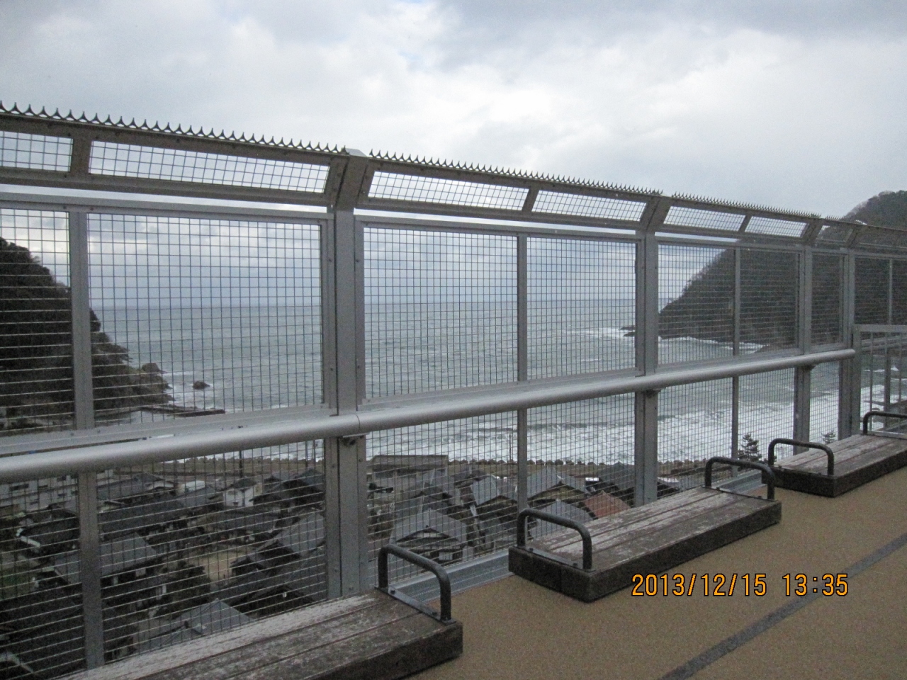 2年ほど前にマイカーで行ったときは、空の駅は工事中でした。下に車を止めて餘部駅まで、曲がりくねった狭い山道をまるで登山でしたが、今回はバスツァーなので、手前の駅から気動車に乗って楽々到着。小雨の降る寒いなかで望む景色は、侘しい冬の日本海そのものでした。