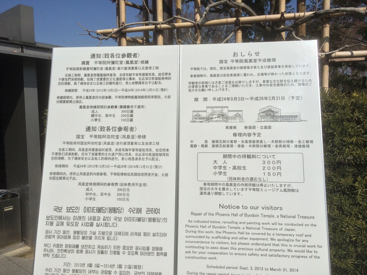 平等院鳳凰堂を是非見たいと前々から思っていたのですが旅行期間中は改装中のようでした・・・
