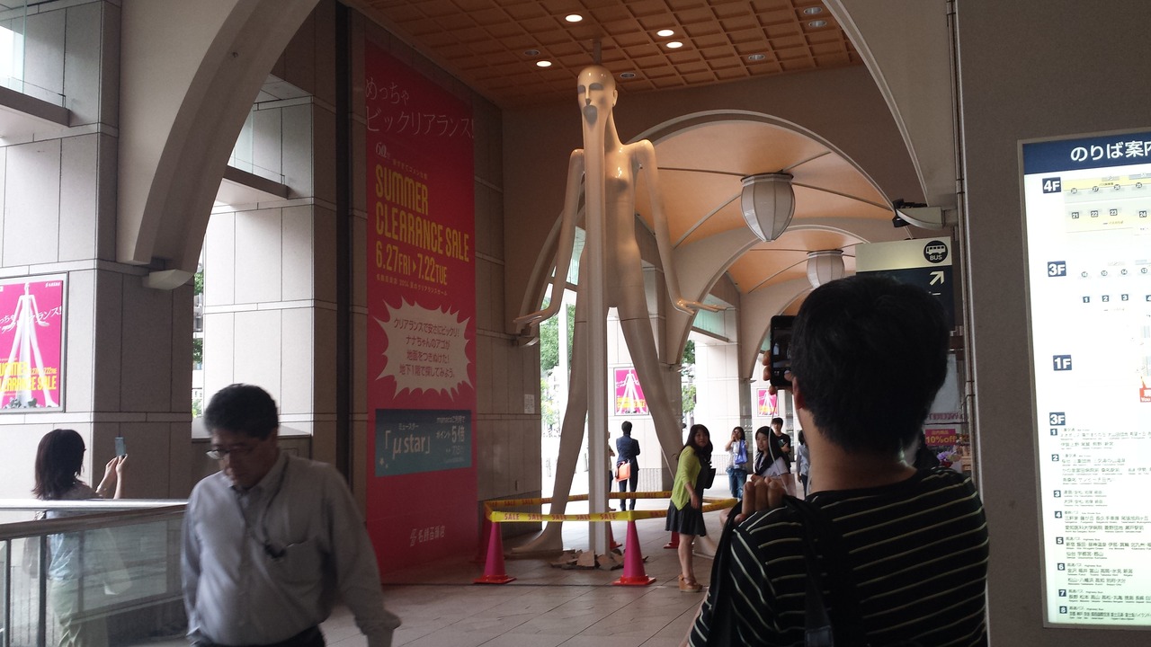 名古屋駅前の名鉄百貨店1階屋外にある人形です。待ち合わせスポットのようでした。高さ3メートルほどの大きさで目立つ上、訪問時はクリアランスセールの安さに、ナナちゃんが、顎をはずすほど驚き、下顎が床を突き抜け、地下の家電量販店に達する、といったシチュエーションになっていました。