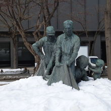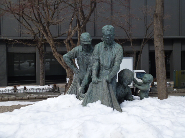 雪祭りが終わり、メイン会場だった大通公園には、雪像を崩した跡であろう、おおきな雪山があちこちにあり、銅像や、記念碑は見えづらくなっています。すっかり雪に埋もれてしまっているものもあります。この像のあたりも、ちょうど除雪中でした。力強さの感じられる像です。