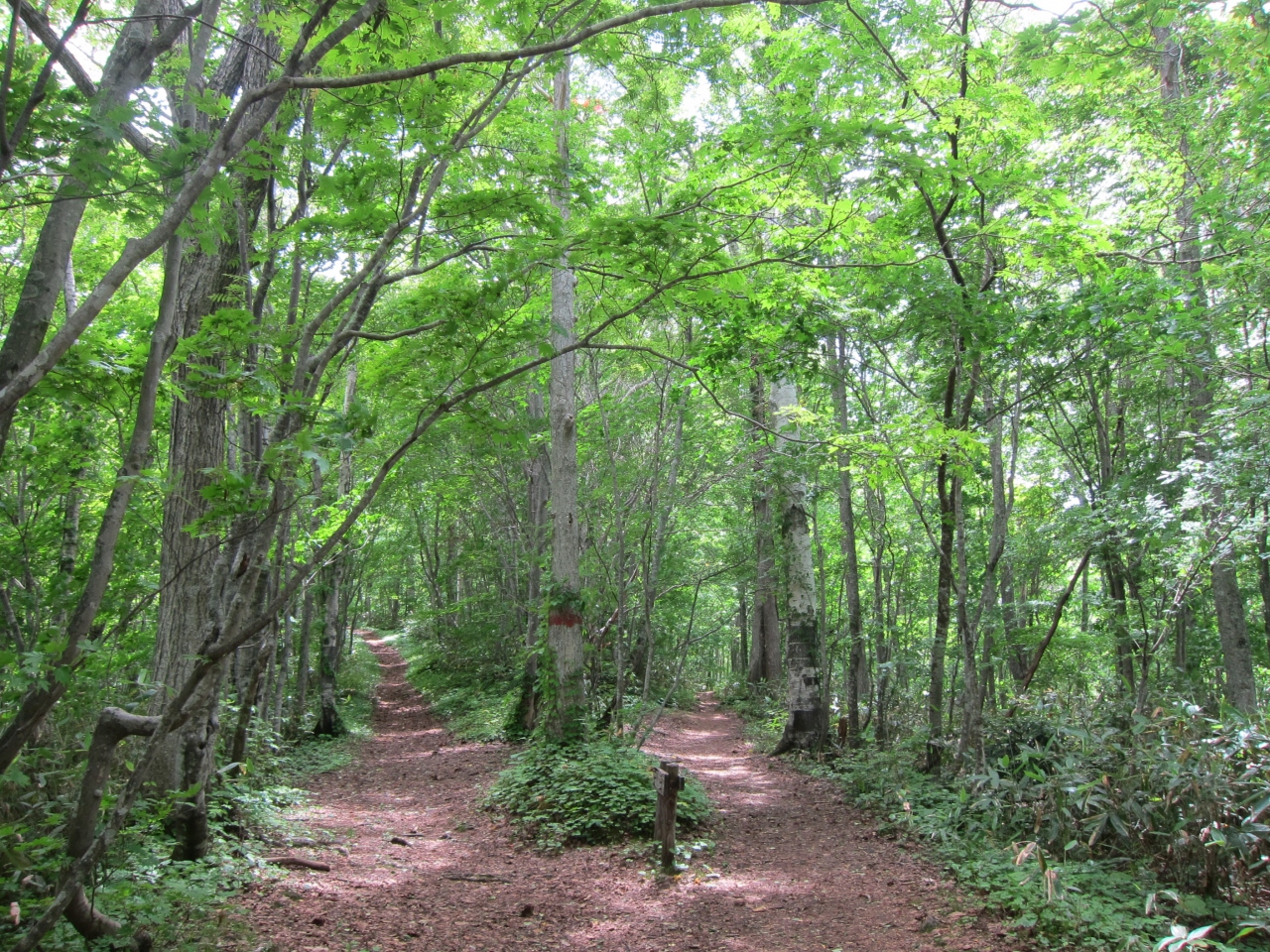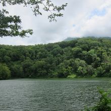 立っていた看板によると、木々に囲まれた湖は、秋の紅葉のころと、春、エンレイソウやシラネアオイが咲く5月下旬がお勧めのようです。訪れたのは6月下旬。エンレイソウは黒い実をつけ、森はいっそう緑を濃くしていました。