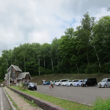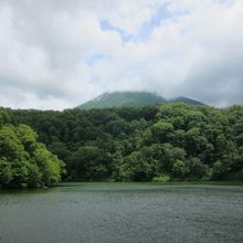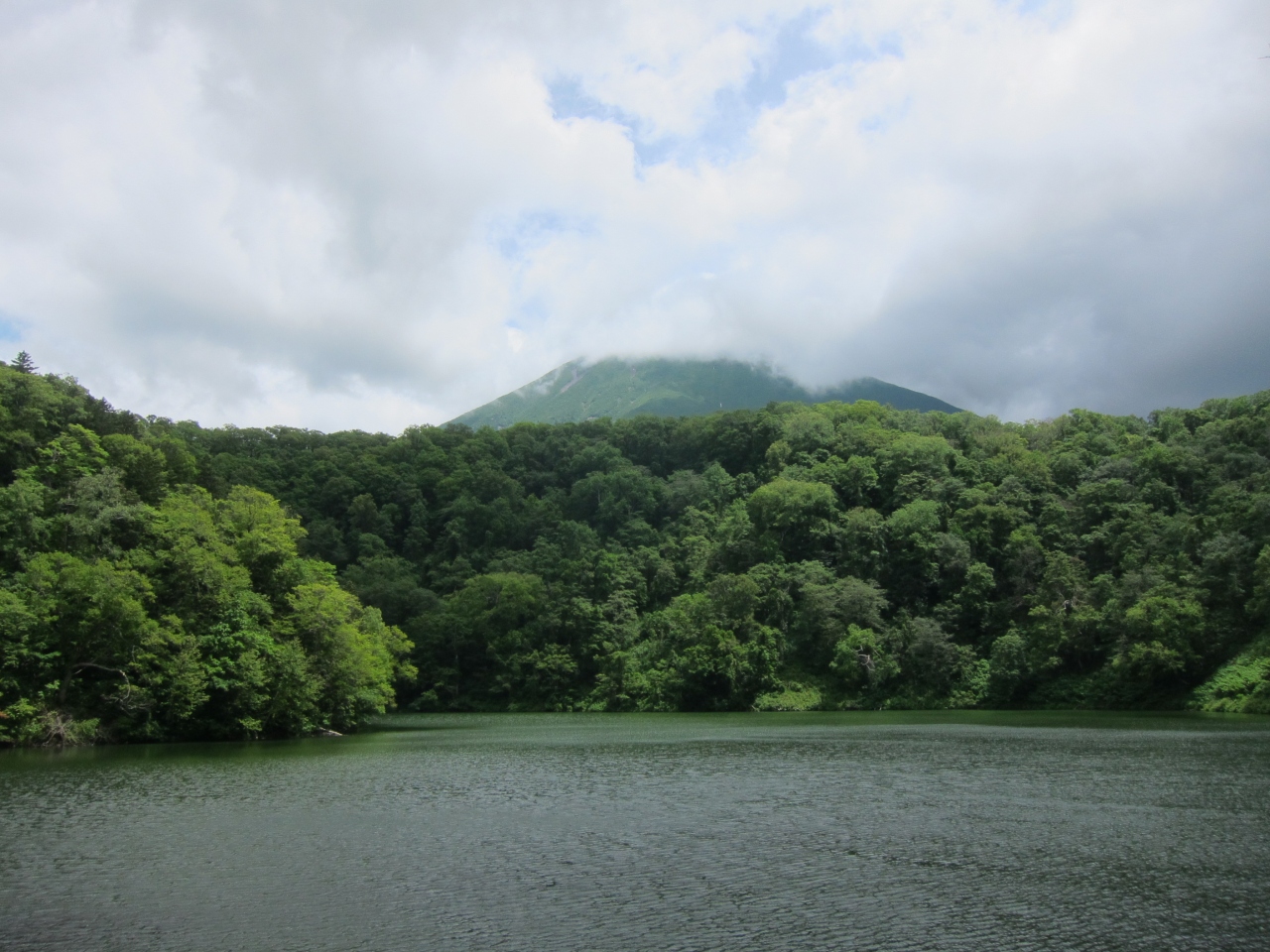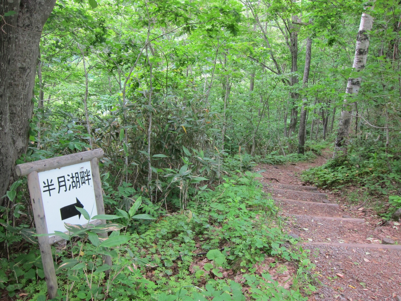 羊蹄山の比羅夫登山口のところにあります。森に囲まれ、見えにくいですが、登山口へ向かう舗装道路のすぐ脇に半月湖を周回する周遊散策路があり、そこからは木の間越しに時々、湖を見ることができます。標高270mと低い位置ながら、噴火口に水のたまった火口湖です。火口の外輪の周遊散策路は、一周約2kmの森の中の道です。散策路といっても、傾斜があり、羊蹄山の登山道のような道です。