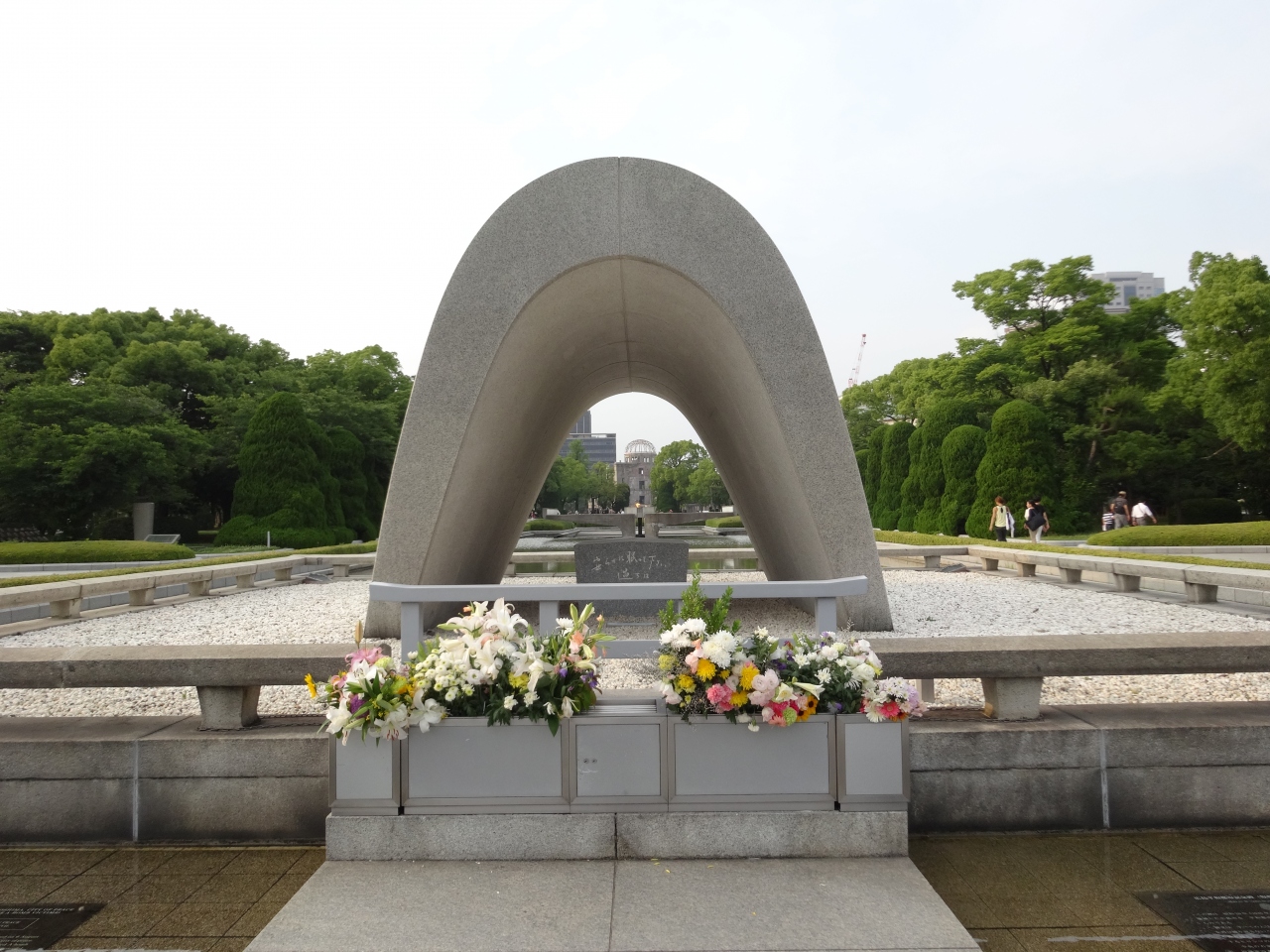 この碑の正面に立つと、アーチ状の慰霊の中から真っ直ぐ先に原爆ドームが見えます。計算し尽くされた整然とした美しさから、戦争の悲惨さや平和であることへの感謝を今へ伝える静かな説得力のようなものを感じました。