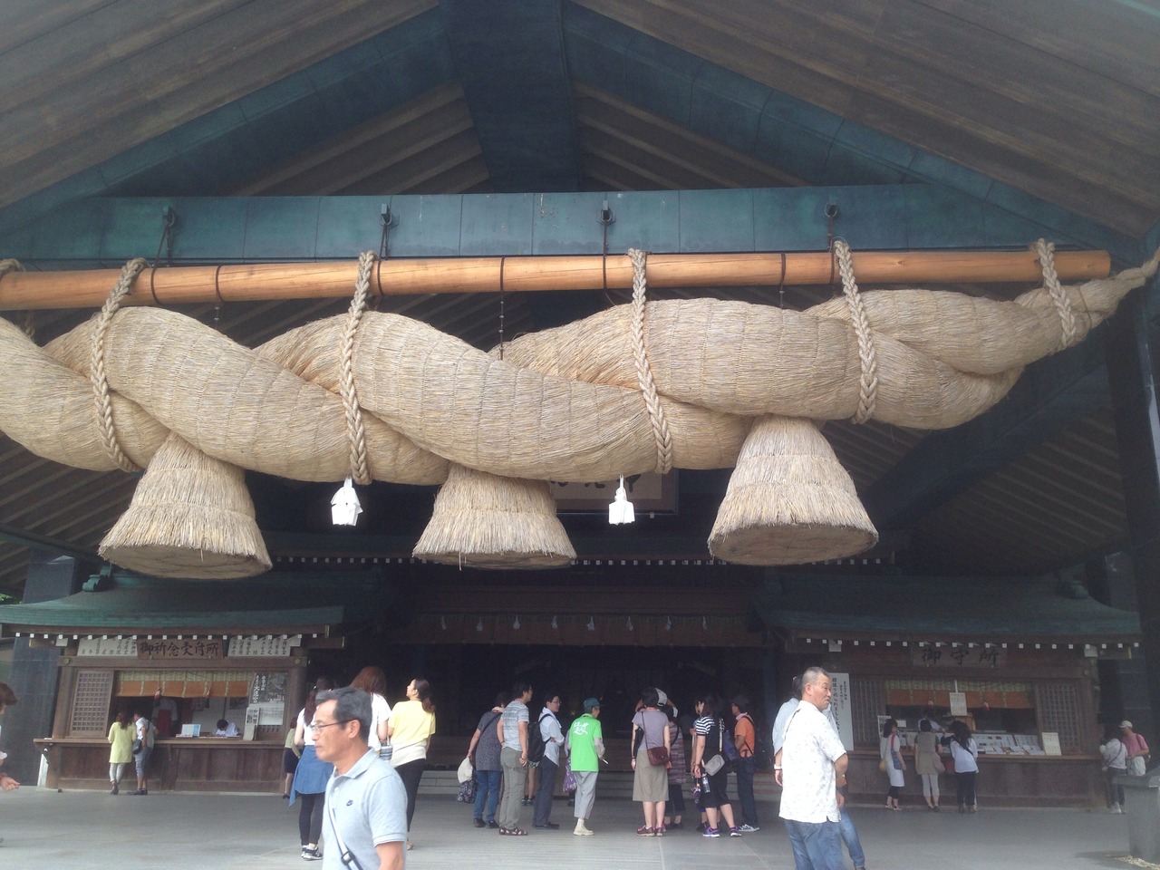本殿の中には天井に色鮮やかな雲が7つ描かれています。出雲の和歌の枕詞は八雲たつ、ですが、天井に7つの雲を描いたのは、神様も完璧な存在ではなく、完成されないことにより伸び代をもつという意味が込められているそうです。ちなみに出雲空港の出発ロビーの天井には白い雲が8つあり、完成されています笑。