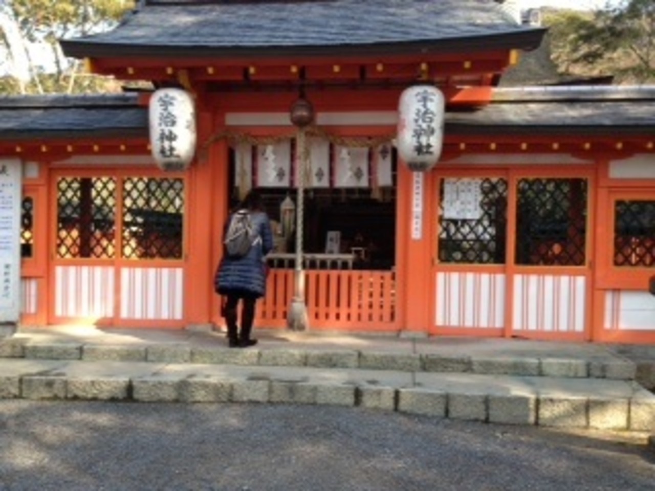 平等院を観に行ったが、改修中だったため、諦めて、宇治川を渡り宇治神社を見学する。朱色の本殿は映える色で、重要文化財に指定されているとのこと。宇治川ほほとりで、散策しなからの神社巡りもまたオツなものである。