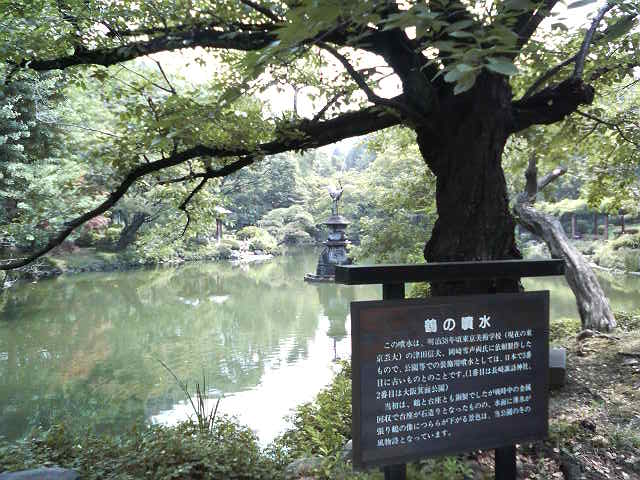 池のほとりにある案内板によると日本で三番目に古い噴水とのことで、歴史を感じる色あせた鶴が涼しげに水を噴出していました。