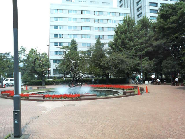 シャープなデザインで東京の鳥である「ゆりかもめ」を表現していて、官庁街のビルに近いこともあり、噴水の周囲は貴重な安らぎの場となっていました。