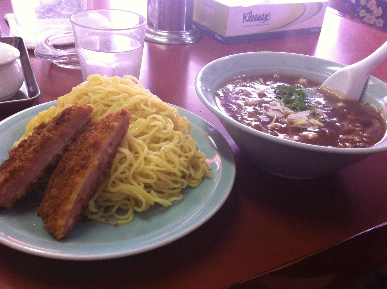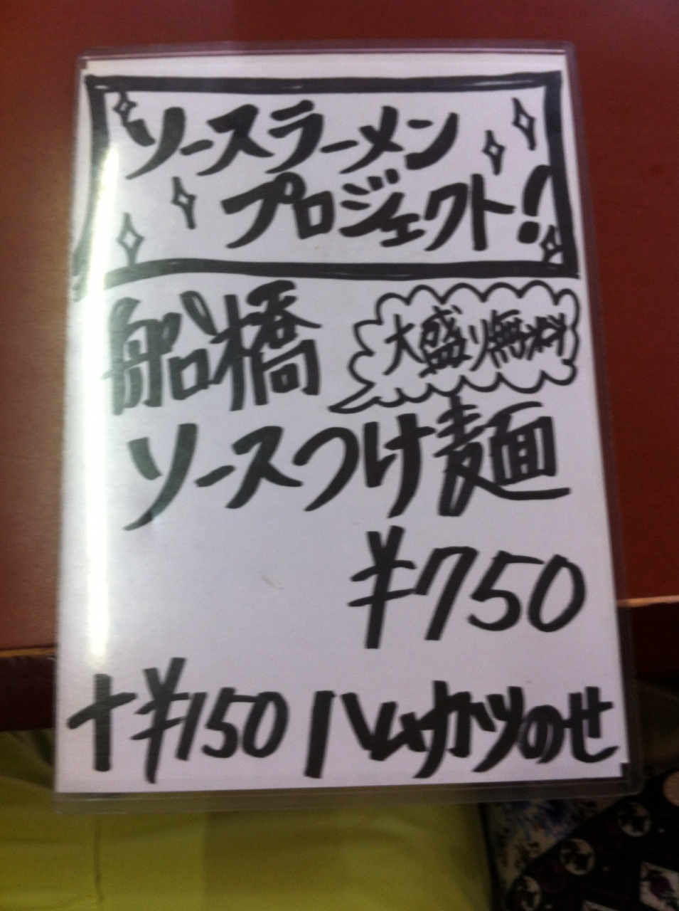 船橋のB級グルメといえばソースラーメンですが、ここはふなっしーもおススメのお店。船橋駅から歩いて行けるところにあります。見た目は昔からやっていそうな店構え。入ると「ふなっしーのDVDで紹介されました!」と、ソースラーメンを宣伝しています。ここではラーメンの他に、つけ麺もやっているとのこと。それぞれハムカツをトッピングで付けることが出来ます。ラーメンは紅ショウガに青ノリと、まさにソースやきそばがラーメンになった感じ。ソース焼きそばが好きな人にはたまらないでしょう。