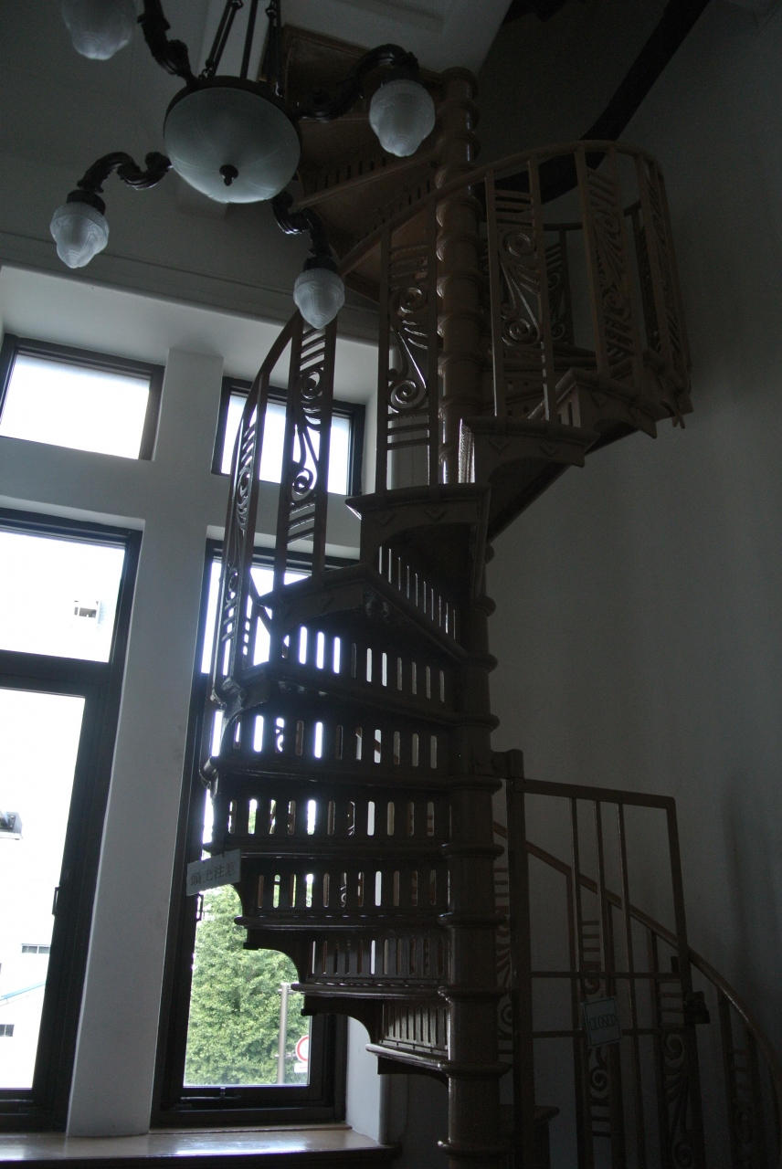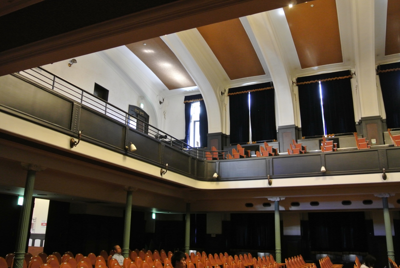 私が行ったときは、ピアノのコンクールが開かれていて、一般の人も鑑賞できるということで、普段は一カ月に一回しか一般公開されていない講堂に入ることができました。客席の配置が昔風で、同じレンガ造りの大阪中ノ島の中央公会堂を思い出しました。廊下や階段は自由に見ることができ、横浜らしく船や、江戸時代の旅の様子を描いた大きなステンドグラスが素晴らしいです。螺旋階段の意匠も凝っていて興味深かったです。