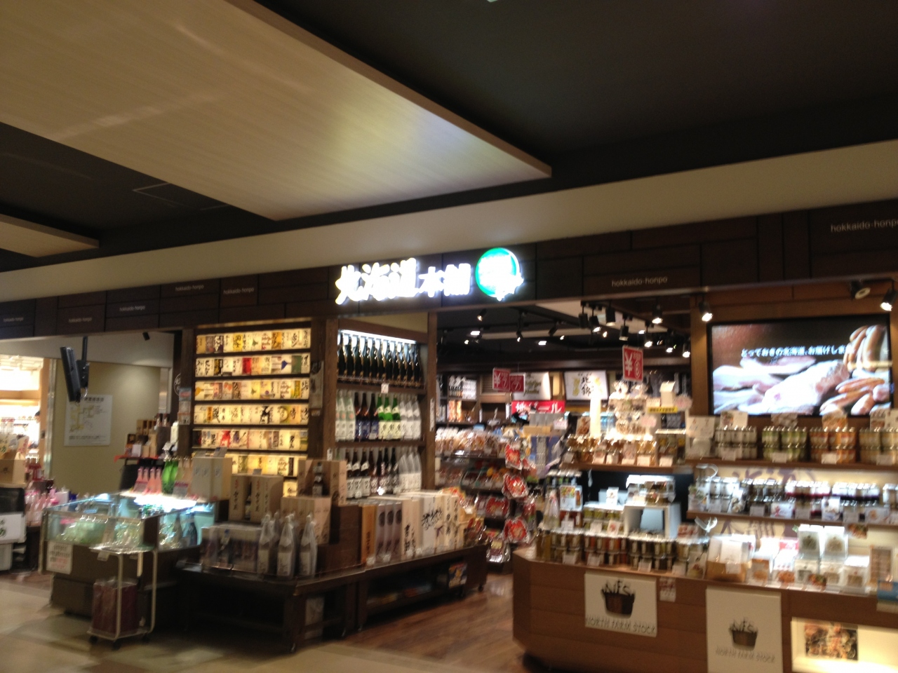 新千歳空港2階にあるお土産ショップです。広い店内には北海道銘菓、海産物、畜産、農産物、工芸品など、北海道らしいお土産がひと通り揃っていました。店頭で目立っていたのが地酒は種類も豊富でした。ワインや地ビールもあり、お酒好きな方が楽しめるお店だと思います。