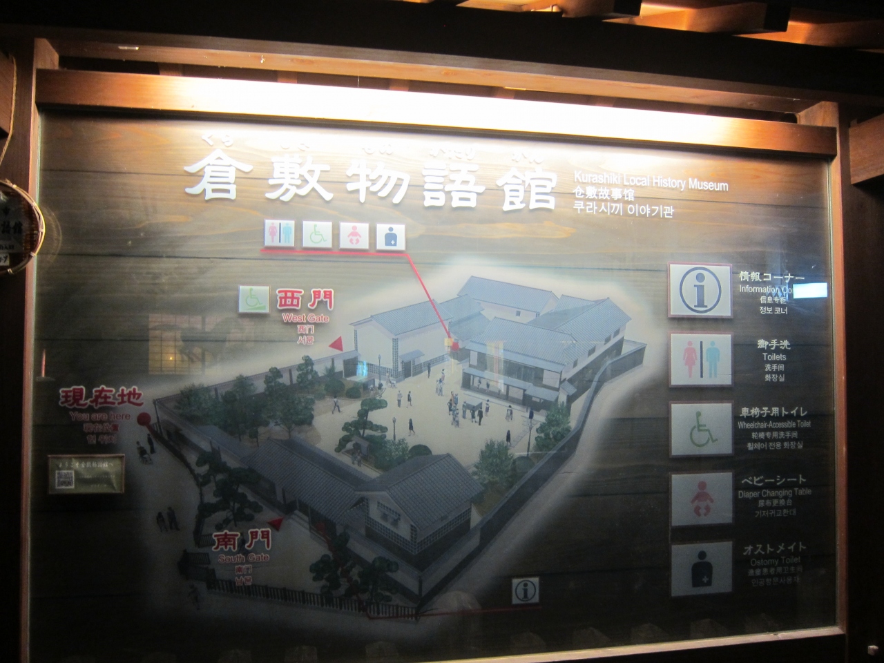倉敷美観地区の倉敷駅側の入口あたりにあります。倉敷市が運営するイベント施設でもありますが、美観地区の中程にある倉敷館のほかにも、ここで観光案内をやっていたり、簡単な展示をしていたりします。有料ですが、入口そばの情報コーナーではコインロッカーもあるようです。