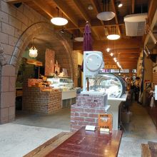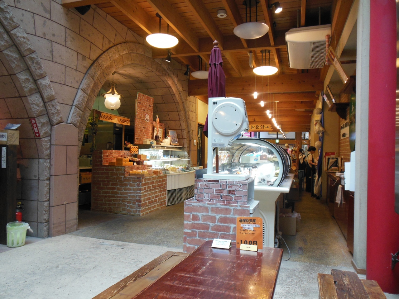 奥に細長い建物に、おなじみかすたどんやかるかん、洋菓子、駄菓子、民芸品などいろいろ売っています。二階にはカフェもあるようです。