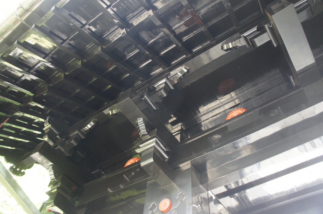 それにしても、内部の木組みもすべて黒い漆が塗ってあって、ここまでするかなあという豪華さ。漆は日光に弱いので、理にも適っていないと思うのですが、どういう趣味だったのか。理解に苦しみます。