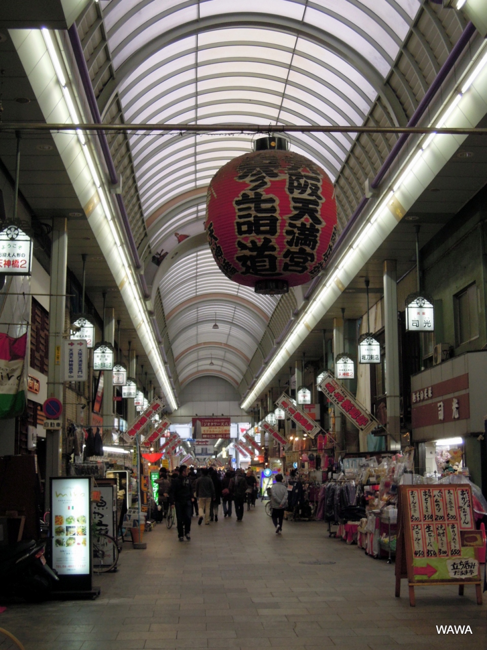 天神橋筋商店街は天神橋1丁目(南詰)から6丁目(北詰)まで、南北に一本で続く長い長い商店街です。2丁目付近には商店街の名前の由来とも言える大阪天満宮があり、3丁目と4丁目の間にはJR環状線の天満駅、6丁目の北端部分には「大阪くらしの今昔館」博物館があり、買物や食事以外にも色々と楽しめる活きた商店街です。