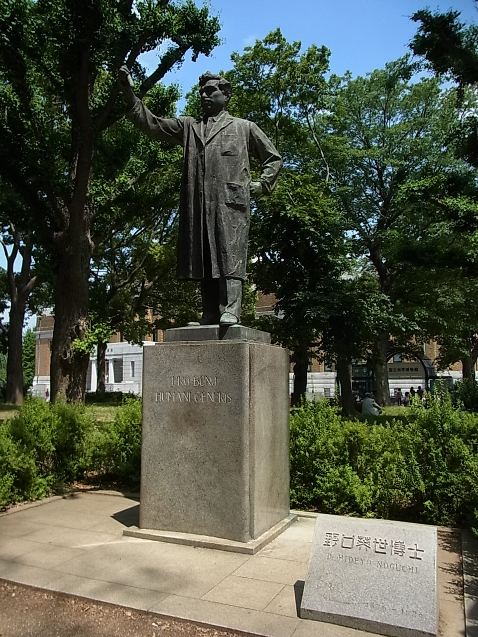 科学博物館の前に、野口博士が立っています。