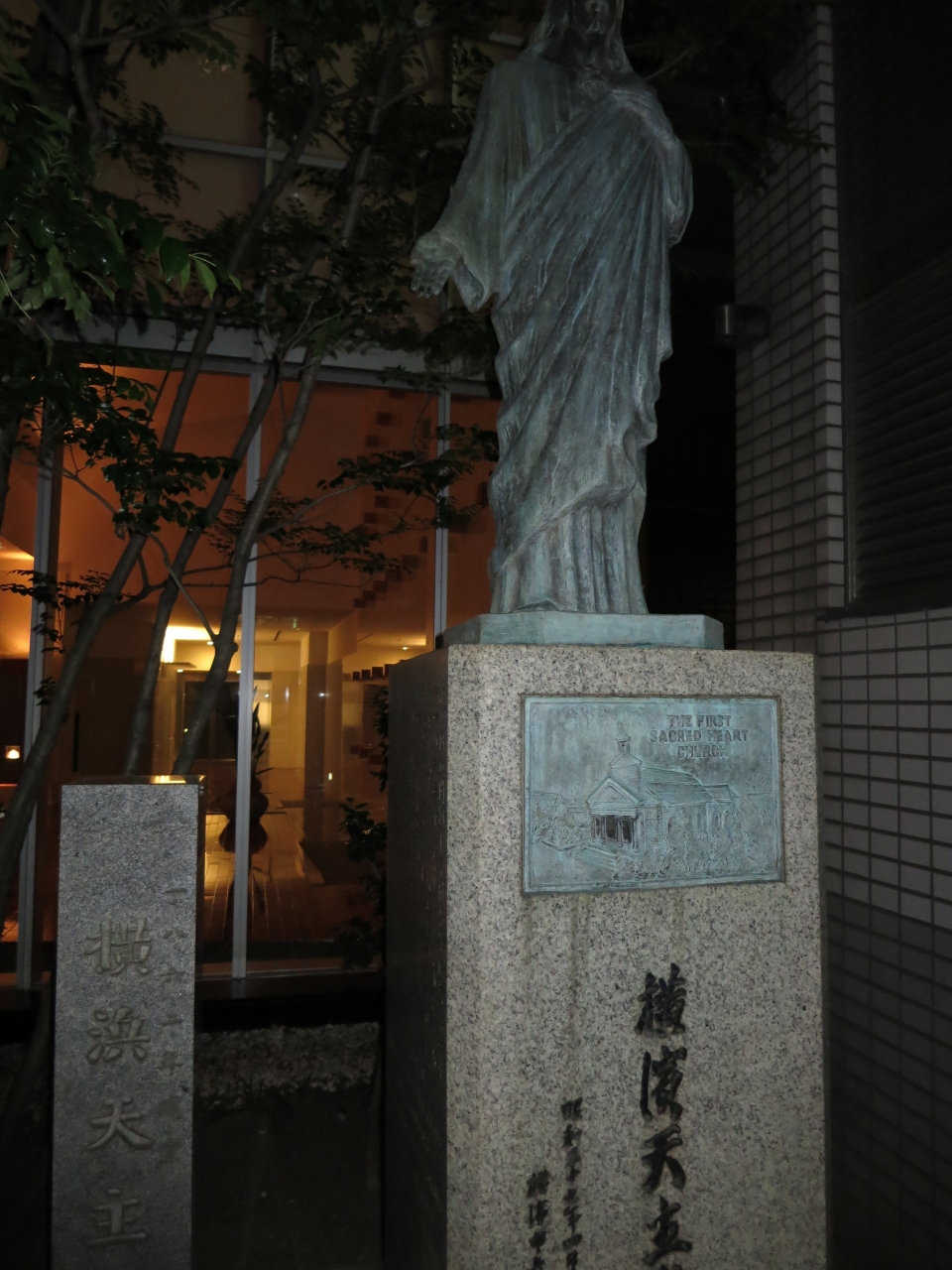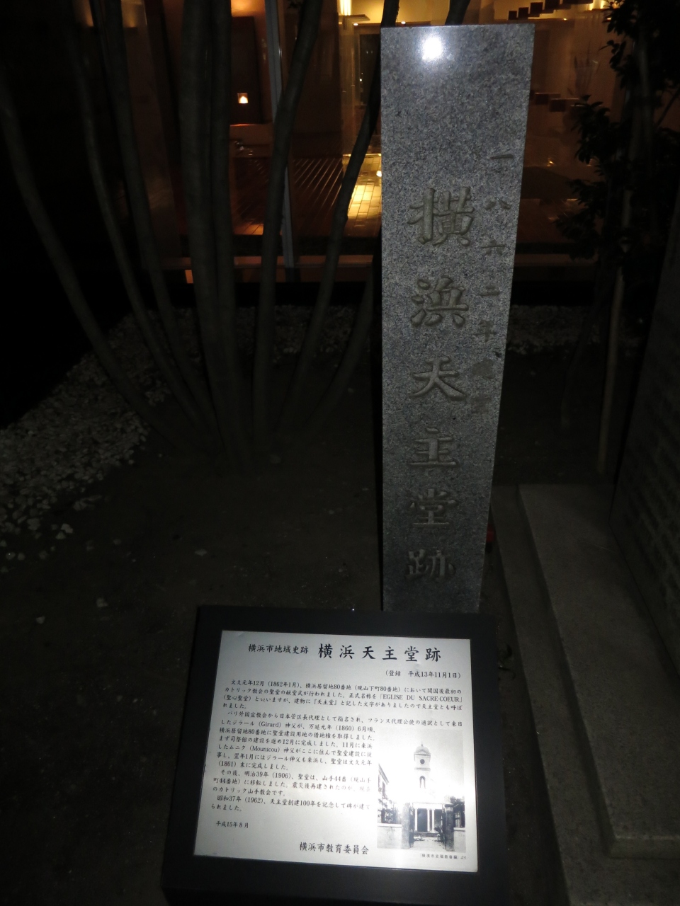 横浜中華街から元町・中華街駅に向かう途中、ビル前の小さな敷地に横浜天主堂跡の記念碑を見つけました。夜で近くに木が植わっており分かり辛いです。横浜開港後、初めてキリスト教会が建設されたのがこの地でであったそうです。