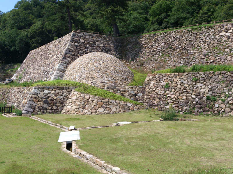 国内唯一と言われる丸石垣。1807年頃、通常の石垣部分に崩落の危険があり亀の甲羅のように追加構築されました。川の護岸や港の突堤に関わる職人の仕事らしいので、こういう形になったのでしょうか?