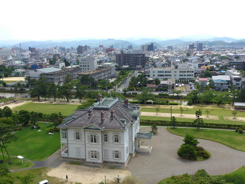 石垣の上からは鳥取中心部が良く見えます。手前に見えている洋館は仁風館です。こちらは有料で150円です。大正天皇が皇太子時代に鳥取に行幸された時に、宿所として建築されました。3泊4日の滞在に、当時の鳥取県の年間予算と、ほぼ同額で建築されました。こちらも是非どうぞ。