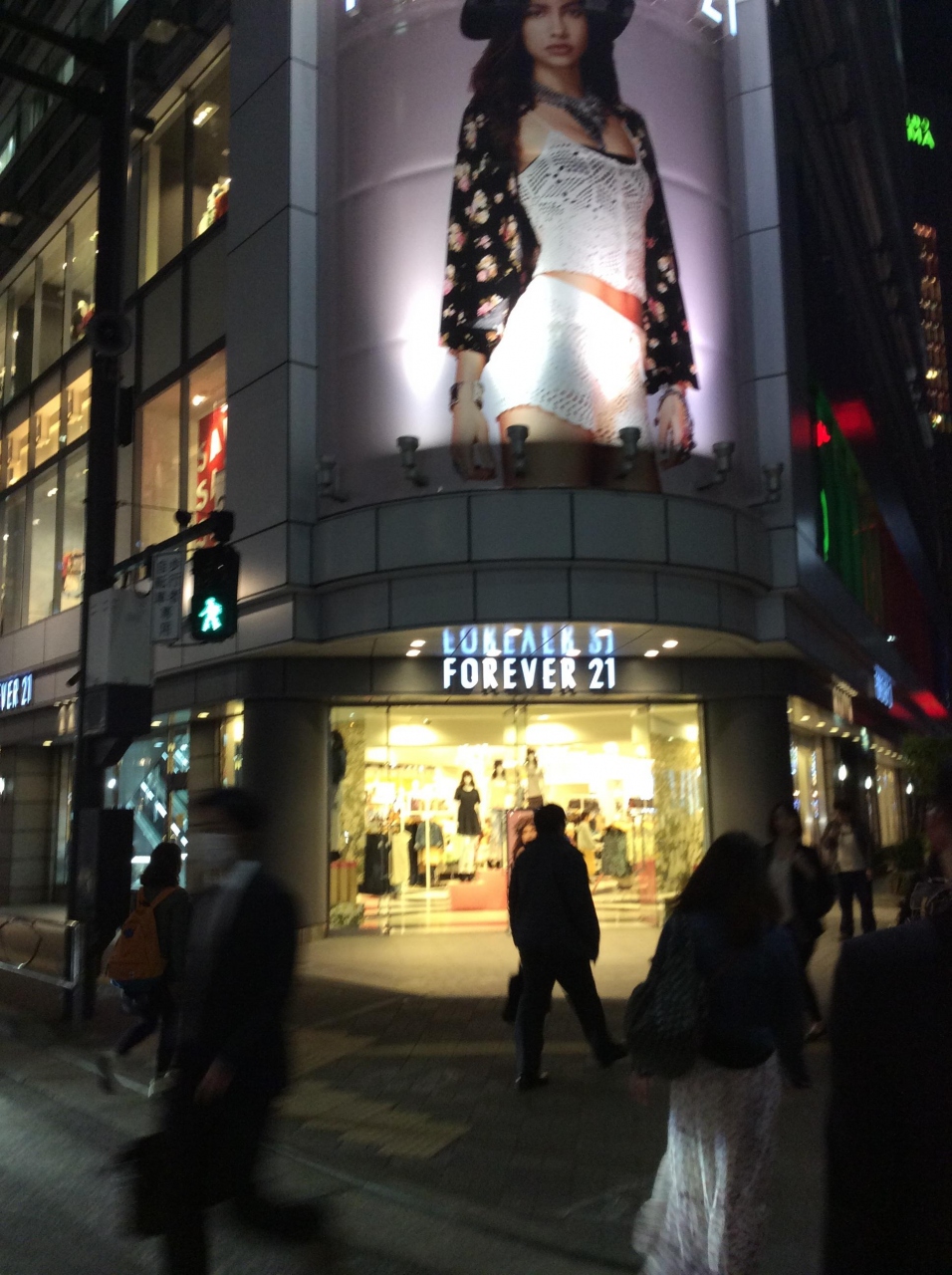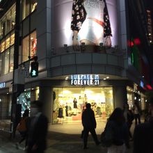 新宿南口から新宿3丁目方面に歩くと、フォエバー21新宿店があります。お店の外観はとても立派です。買う買わないはともかく、流行をみるうえでは、ウインドショッピングをする価値のある場所。メンズもあります。