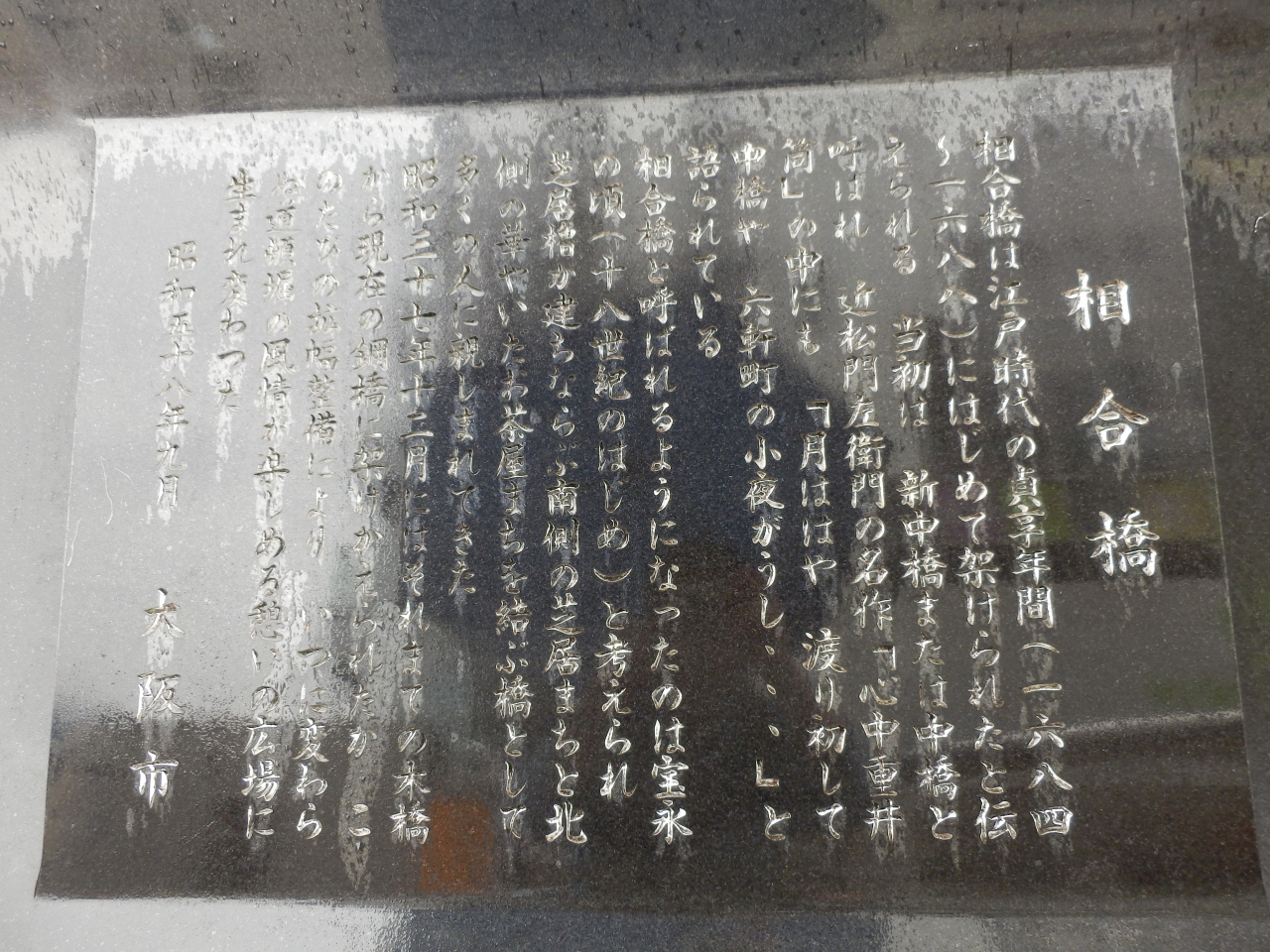 道頓堀に架かる橋で、この付近は繁華街である道頓堀も東の端近い、わたしたちはこの橋をあいあい橋と呼んでいますが正しくはあいあうばしと読む、下流が太佐衛門橋、上流が日本橋。相合と書くのでデートなどに利用するに最適思えますが逆で合わない方が良いとされている、婚礼もこの橋は通らなかったらしい