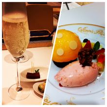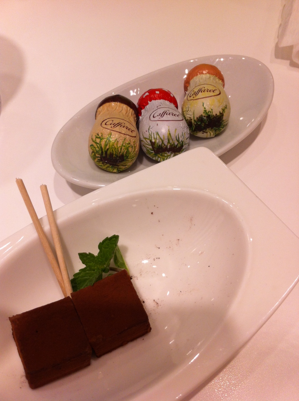 私はジャンドゥーヤとスパークリングワインのセット、友達はきのこのケーキとカフェオレのセットを注文。それと、サービスできのこのチョコを一つずつ頂きました。