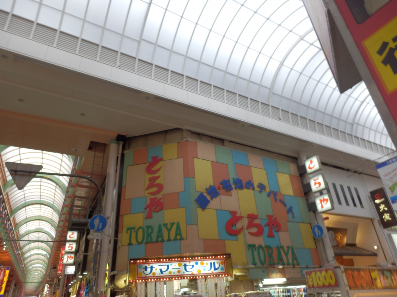 なんば高島屋側から戎橋商店街を入るとみぎ側にあります角店なのでに二方に商品の服地見本がうずたかく陳列、同行者の高年令女性の目的一つは、とらや、で服地を選ぶことにあった、ここは生地を反物状にして陳列してありお客は何メートルほしいと言えば定員がその生地の小さな見本を切り取り二階へ送るとその長さ分の生地が下へ届くらしい面白いシステムだ