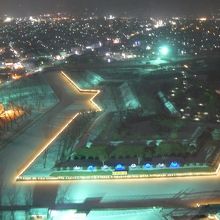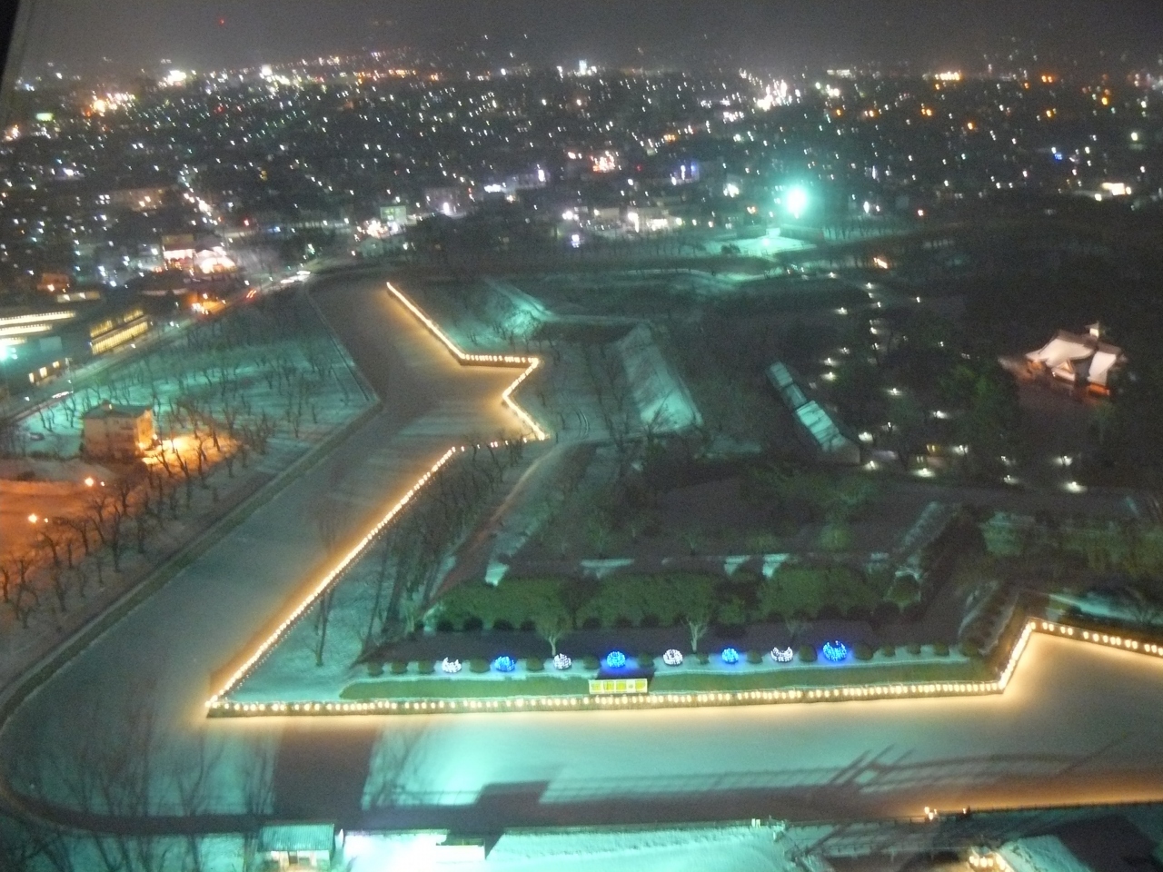 五稜郭タワーから、真っ白な雪の中に星の形のイルミネーションが綺麗だろうと期待をしていきましたがちょっと残念(TT)イルミネーションが下に向けて付けてあるのか手前は形がわかるのですが先はイルミネーションがかけて見えませんでした。