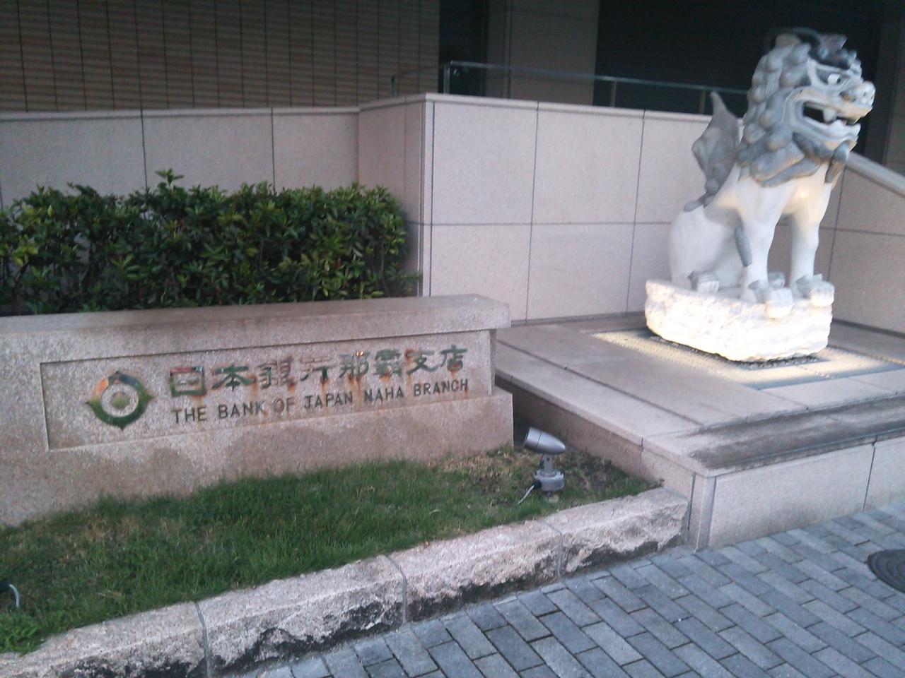 な、なんとシーサーが門のところにいるではないか。日本銀行らしからぬ柔軟さだと思った。横浜支店等も行ったことがあるが、とても無機質で、その門構え等は役所そのものだった。ここの那覇支店は掲示板こそ、他の支店と変わらぬ味気なさだったが、沖縄らしさを感じることができた。