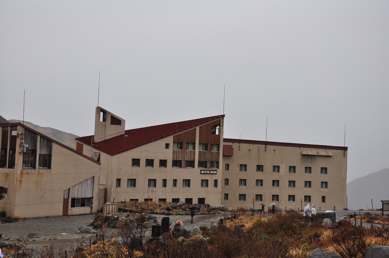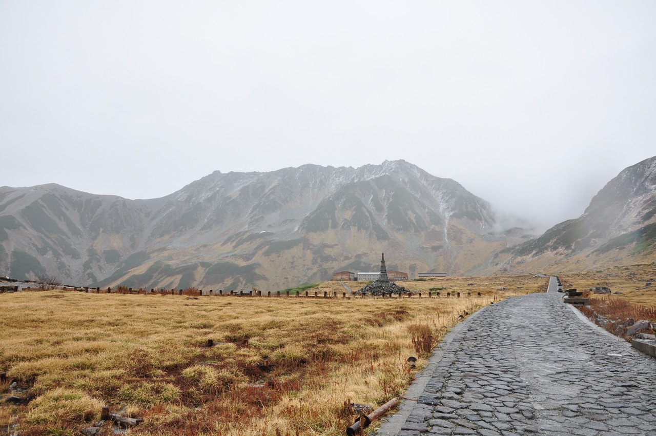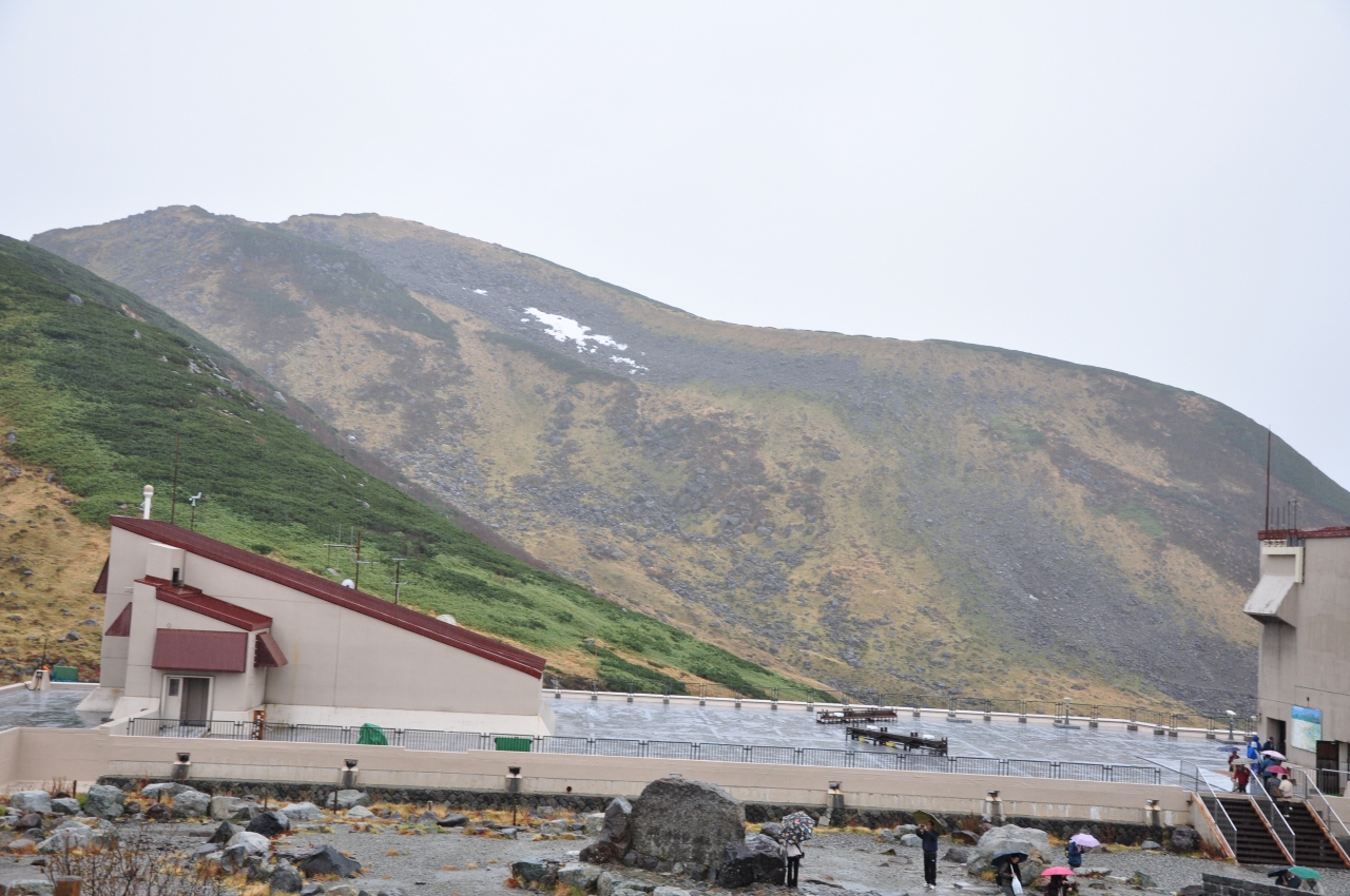 黒部立山アルペンルートを富山側から上りました。午前中に黒部峡谷トロッコ列車に乗ったときはまだ天気が崩れていませんでしたが,お昼には雨が降り始め,台風が近づいているので,山の上はどうなることかと心配しながら室堂平に行くと,雨は小降りで,ガスもかかっていなくて,立山を見ることができました。