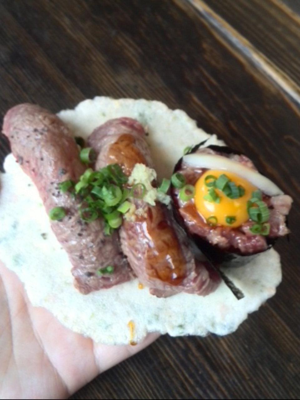 飛騨高山の古い町並みにある、飛騨牛握りのお店、こって牛。何種類かあるなかから、三貫盛りを頼みました。注文を受けてから握ってくれるので、少し待ちますが、エビ煎餅の上にお寿司を乗せて提供されます。炙り、炙り塩、ピリ辛のユッケ風と味が異なるので味の薄いものから食べました。個人的にはピリ辛が一番美味しかったです。三貫900円でいろんな味が楽しめるのでオススメです。