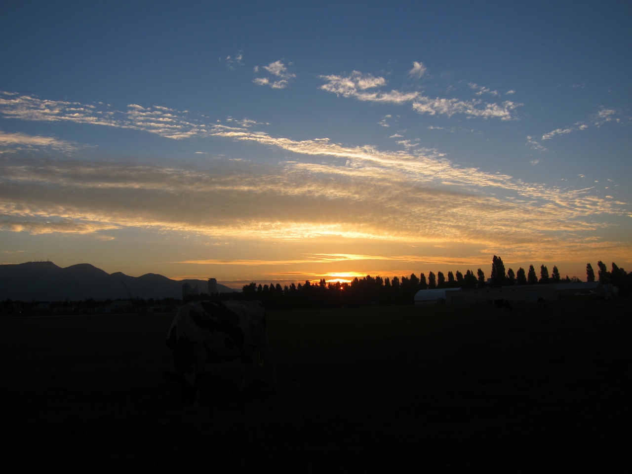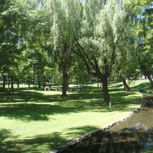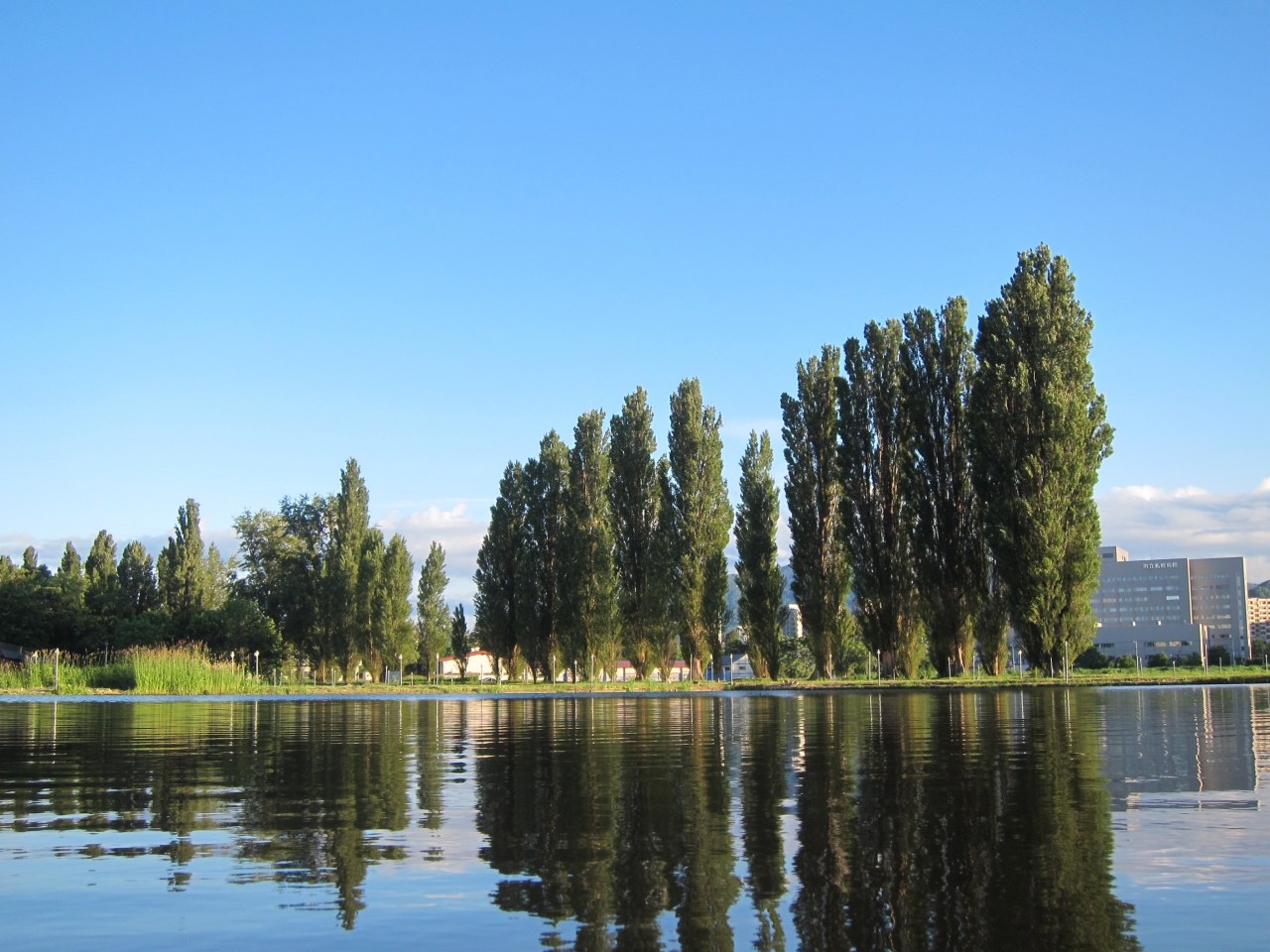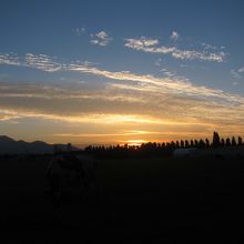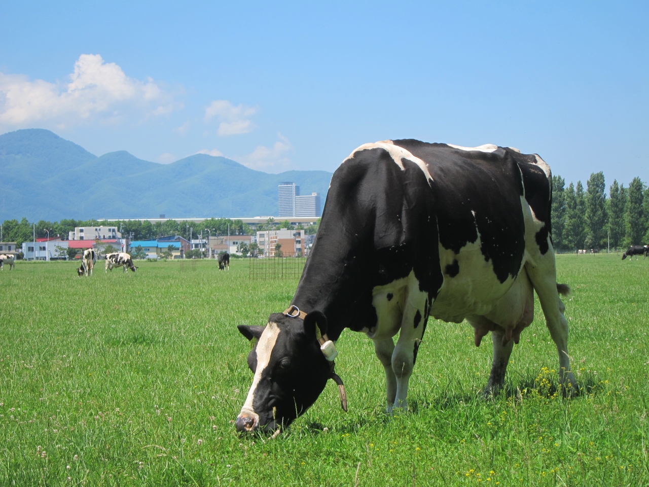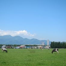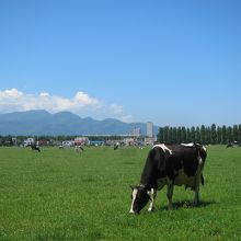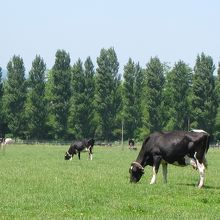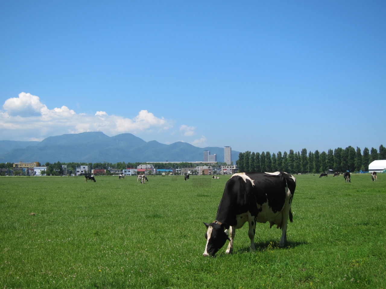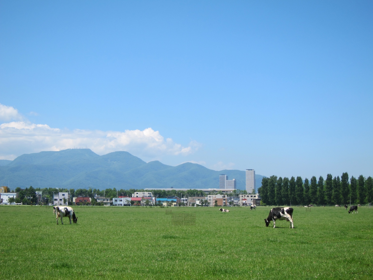 広い牧草地にのどかに牛が草を食む…。これが都道府県庁所在地の主要駅、札幌駅から1km(直線)にある場所の風景でしょうか? 近くにはポプラ並木が水をはった水田に映えてとても心落ち着く風景です。とても北海道らしい一風景です。