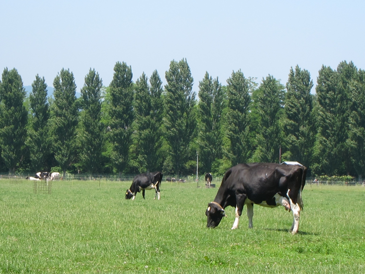 牧場は、大学内の裏手、西側の方にあります。ポプラ並木の奥の方ですが、通常、ポプラ並木にアクセスする南側からは立入禁止となっていて、牧場までは行けません。しかし、大学の工学部の裏からは行けます。大学の真ん中を南北に貫くメインストリートから、工学部の北側の道路に入っていき、工学部の建物の間を進んでいくと、工学部の裏手に出ます。農場を通って大学の西側にでる細い農道があるので、そこから牧場が眺められます。
