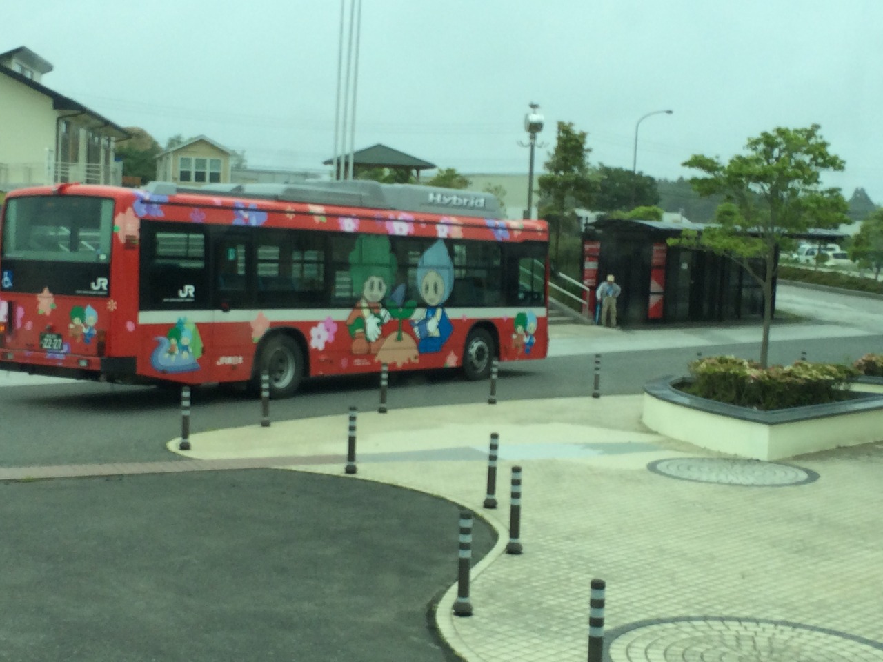 気仙沼で電車の代わりに人々を運んでいるのがBRTです。平たく言うと線路があった場所を走るバスです。高架が津波で無くなっている場所は一般の道路を通ります。