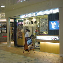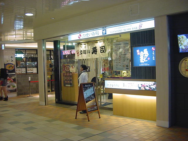 新幹線駅である品川駅構内、「エキュート品川」に入る立ち食い寿司の店。一人でも入りやすく、どの時間帯もにぎわっていますが、急ぐときはテイクアウトもできます。ガラス張りで明るい店内。店の外は乗り換え客などでいつもにぎやかです。