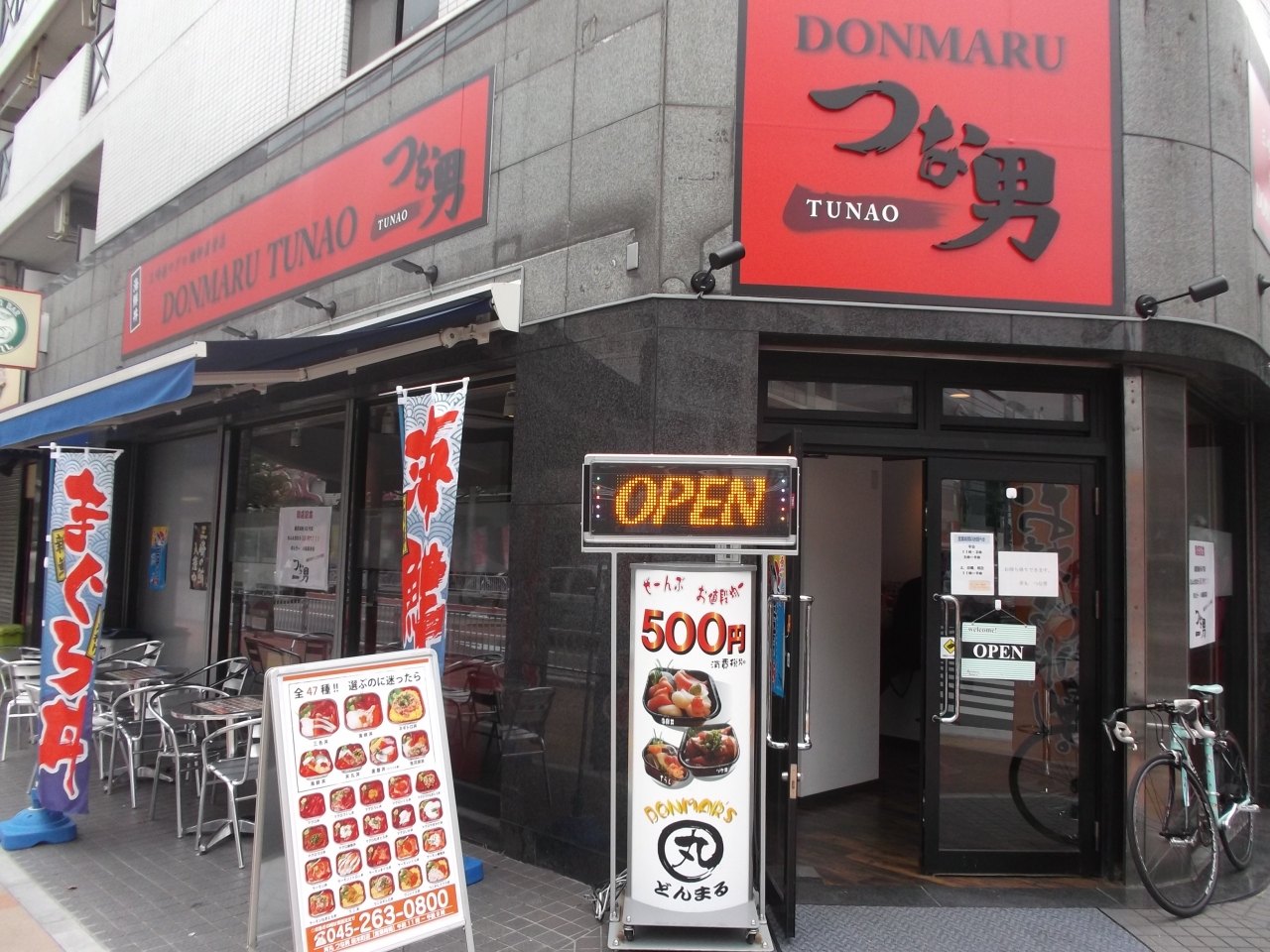 野毛大通り(平戸桜木道路)と野毛本通り・野毛坂入口の交差点(野毛3丁目)の角にあります。海鮮丼・まぐろの幟が閃いています。道路沿いにテラスがあり食事できます。中はカウンター席です。