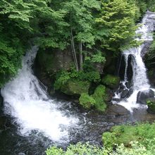「龍頭之茶屋」を抜けると、奥に観瀑台があります。湯川から流れ落ちる龍頭之滝の正面がよく見えます。滝は二手に分かれて落ちてきます。周囲の木々の緑と水のしぶきが絵になります。「龍頭之茶屋」の『施無畏だんご』もお薦めです。無料駐車場もあります。