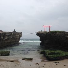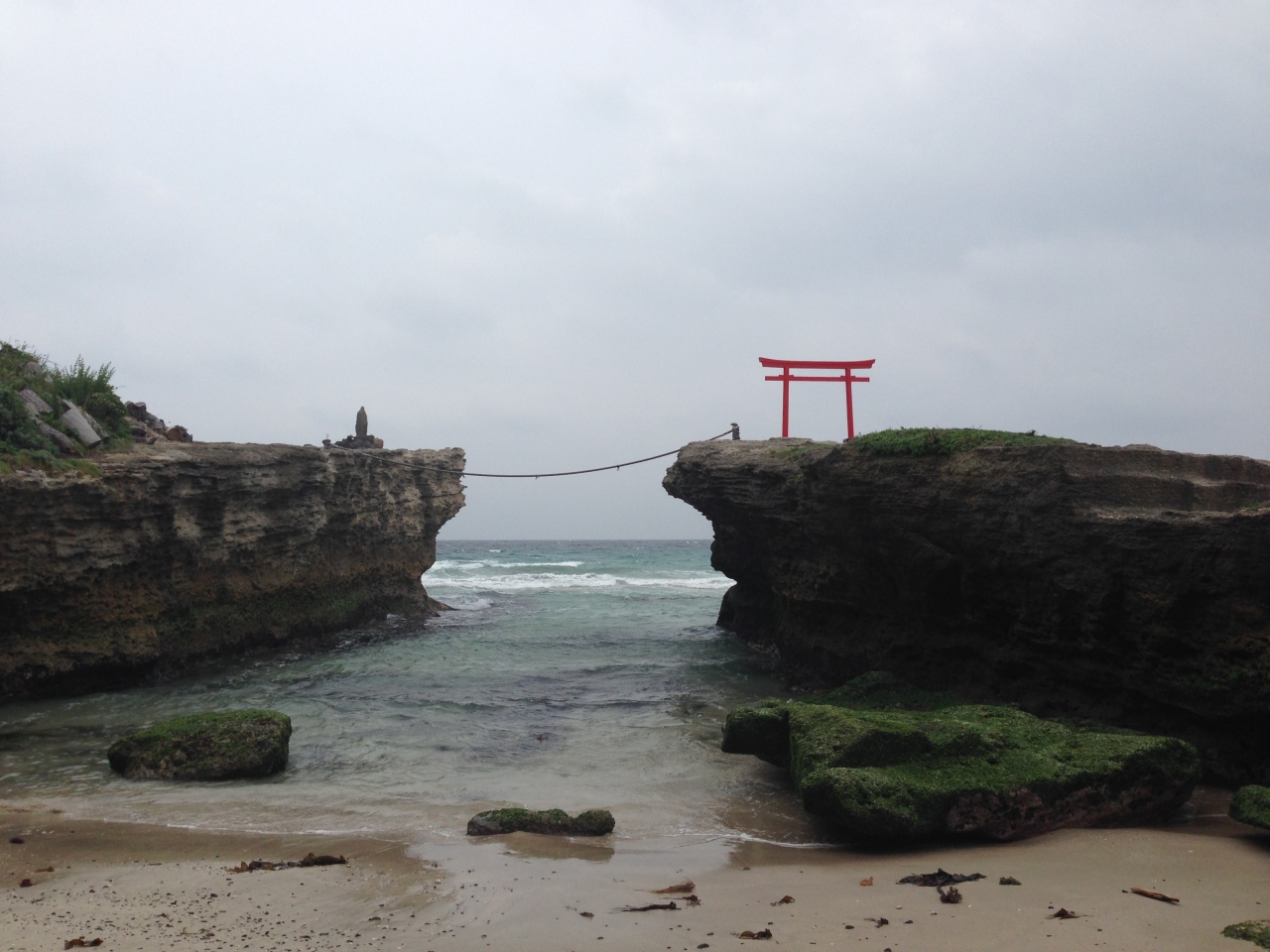 海岸沿いを歩くと岩場に白浜神社の鳥居があり、風情ある風景も。