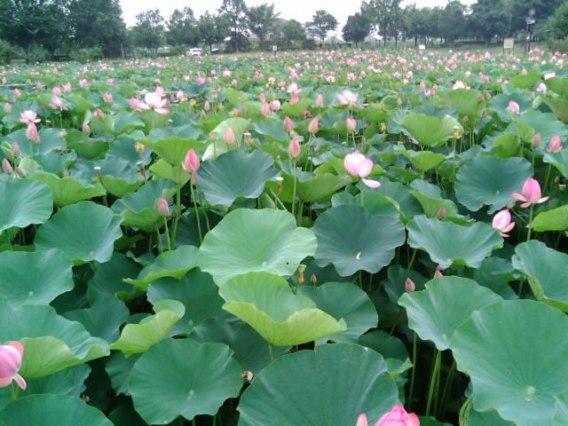 ハスの花が咲くニュースを聞いて出かけました。駐車場の前には、世界のハスなど数十種類が栽培されていました。