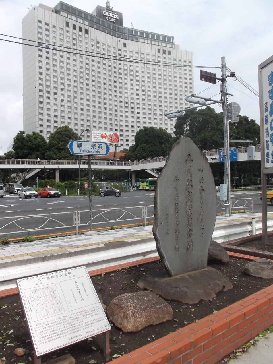 JR品川駅高輪出口の目と鼻の先。タクシー乗り場のあるロータリ中。交番前から信号歩道渡り中程に、駅側に回り込む形で碑の正面に辿りつけます(向かって国道側からが正面=写真)。