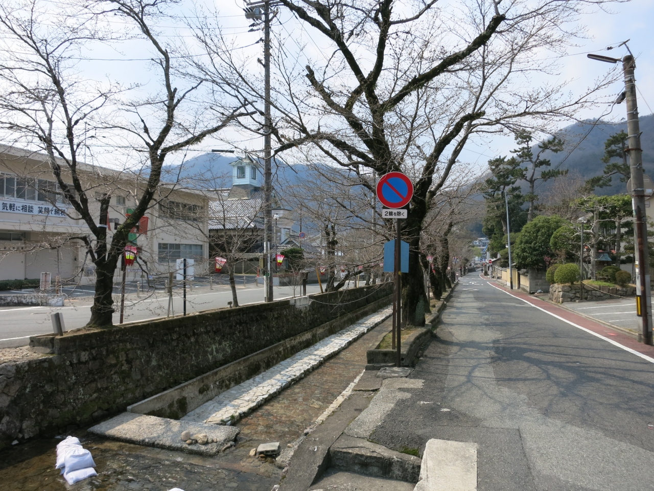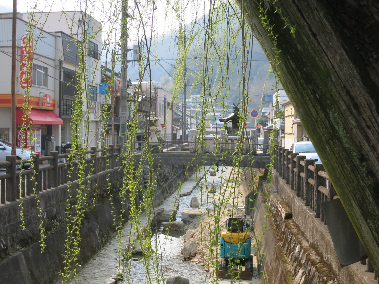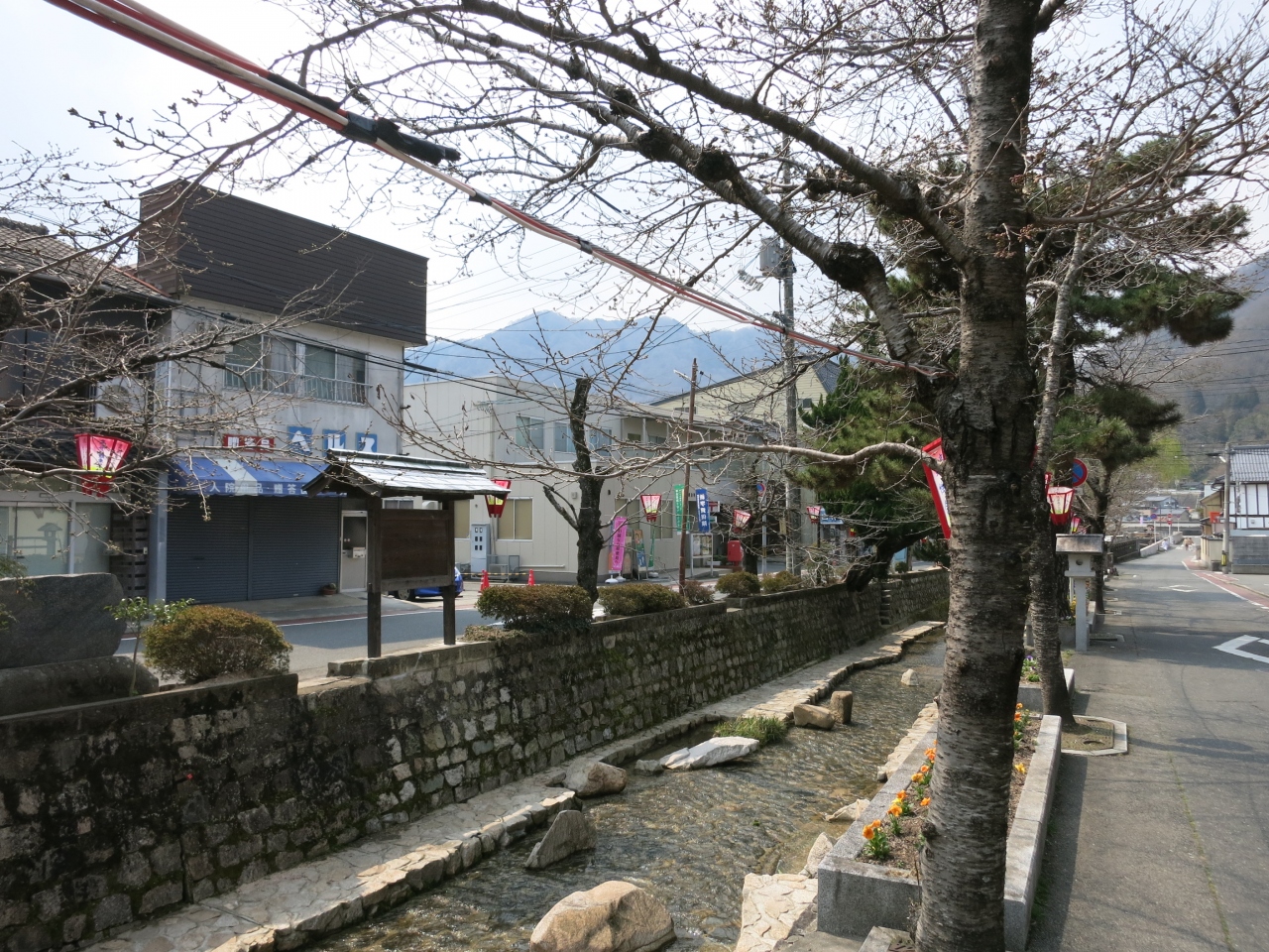紺屋川は、備中高梁駅よりも新見側に800mほど離れたところにある街中の小川で、桜の並木(40本あまり)が植えられています。3月の終わりから4月上旬にかけての開花の頃には美しく川岸を彩ります。桜以外にも柳などが植えられ、石積みのきれいな護岸に、両岸の道路を行く300mほどの川筋は、日本の道100選にも選ばれています。