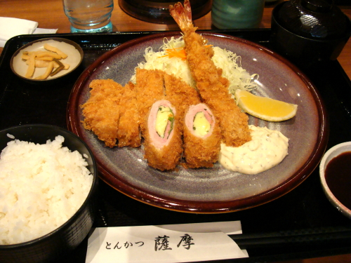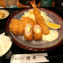 ボリュームランチは、ロースとんかつとえびフライ、しそとチーズを巻いた薄切りポークカツ。