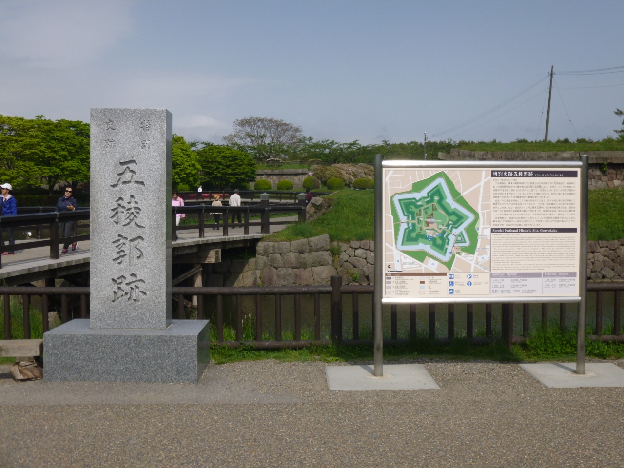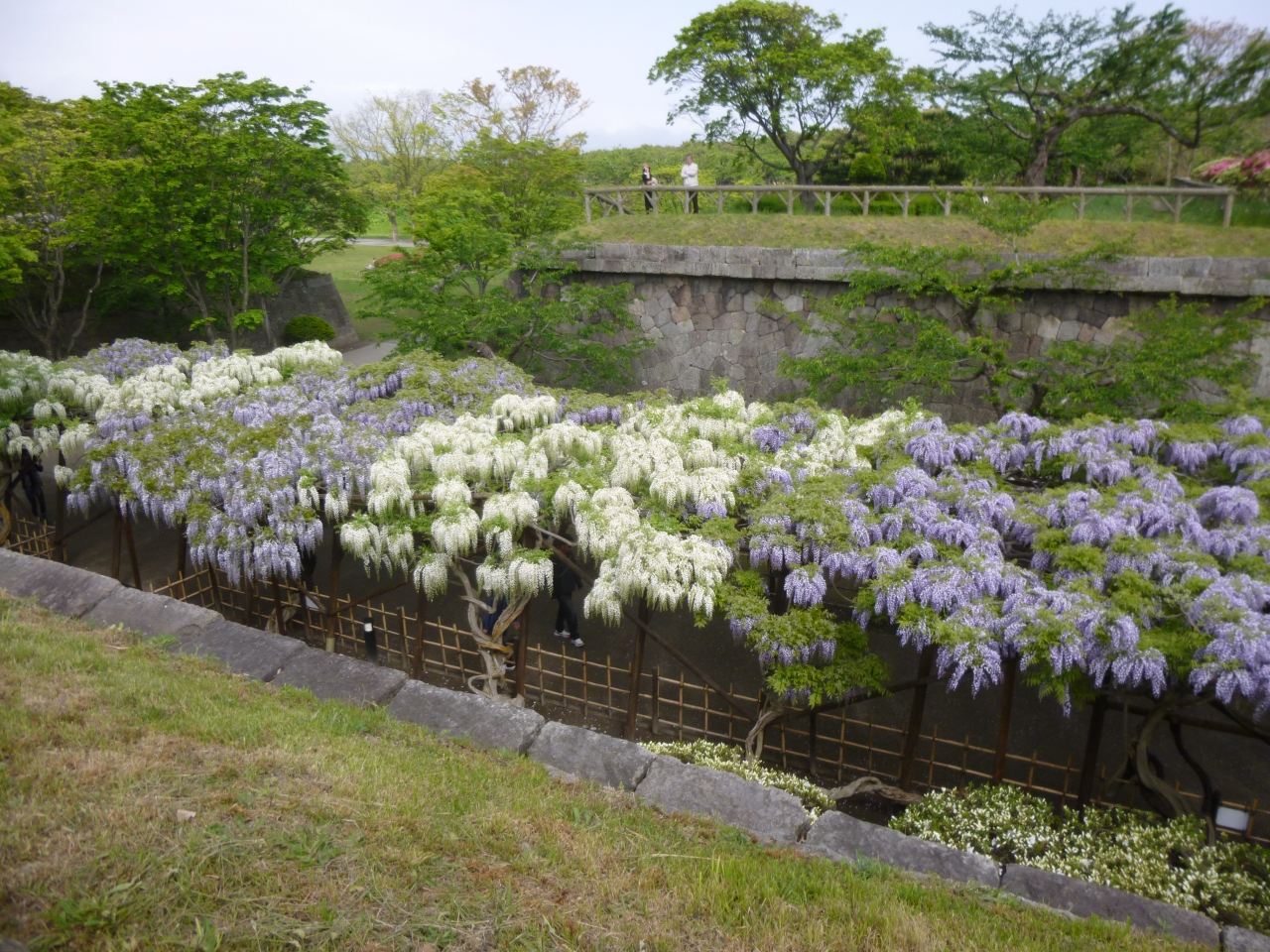江戸幕末、戊辰戦争最後の戦いの舞台となった歴史を伝えて、土方歳三コンテストもあるそうで、今年は築造150年祭で、大勢の観光客が来園していました。広い敷地に函館奉行所もあり、5月末、入口近くに紫と白の藤棚が見事に咲いていました。