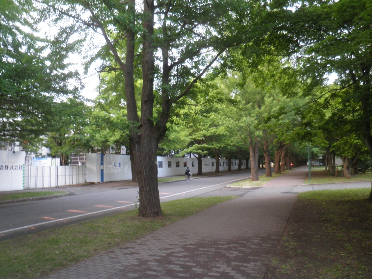 札幌の北海道大学の13条門から入ると道の両側に並んだイチョウ並木があります。 まだ、7月なので葉は生き生きとした緑色です。 この門には守衛さんが立っていて、自動車のチェックをするようです。 都会の中の大学キャンパスだから自由に入れるのではないようです。 また、歩道には白い壁が建てられて何かの工事をしているようです。