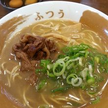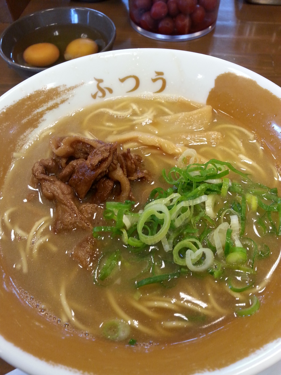 171号線沿いでやや広めの駐車場完備。昼時を過ぎていたが店内は満席状態、まず入口横で食券を購入して待つ。初めての訪問だったんでスープ味は「ふつう」を注文、やや濃いめでクセになりそうなコク深さである。チャーシューではなく甘辛く煮込まれた肉がよく合っていた。この店の売りは生卵がいくつでも無料サービス!これをたまごかけごはん専用醤油で白ご飯にからめて食べる、旨し♪