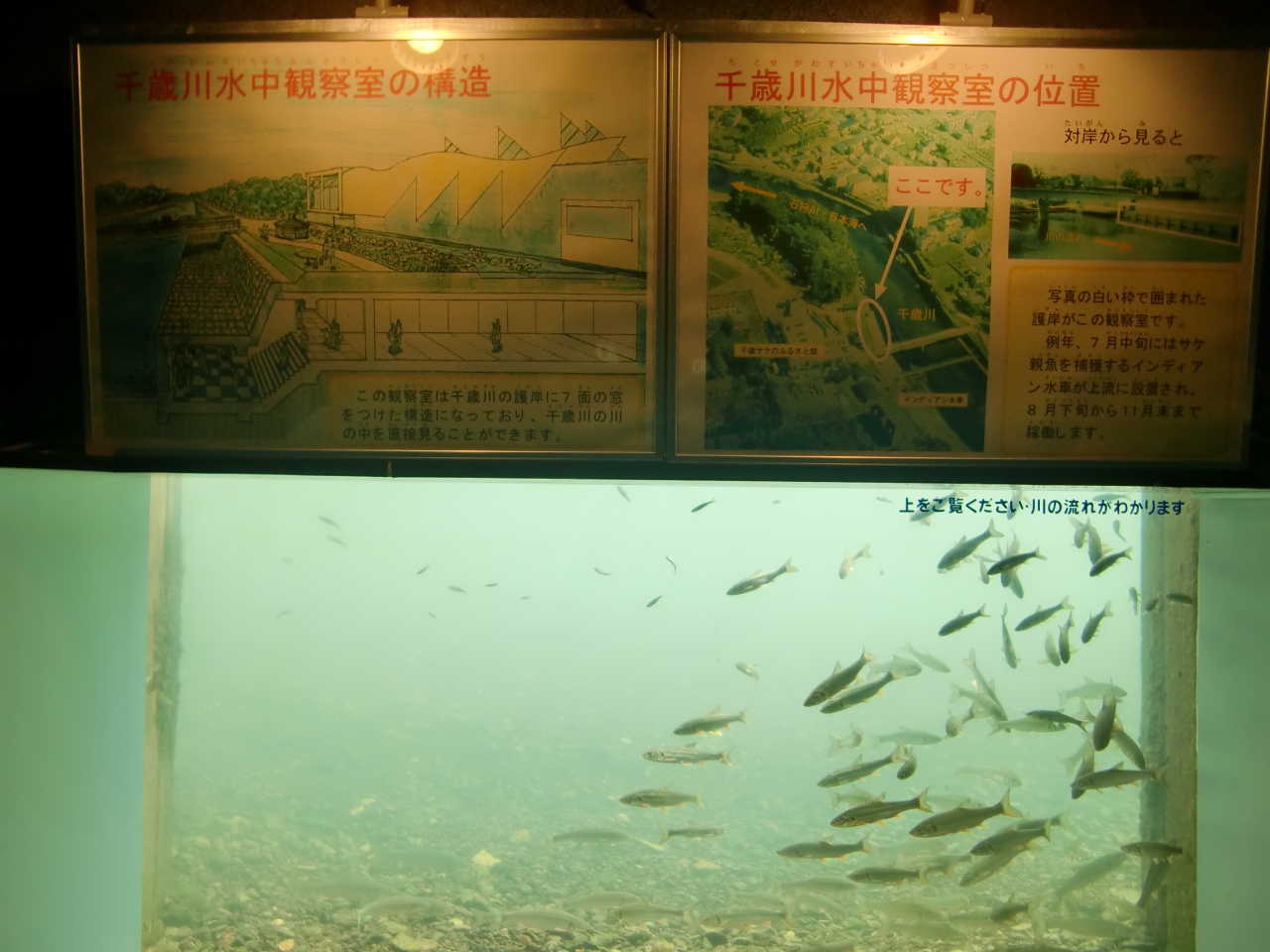 淡水魚の水族館ですが意外と楽しめます。千歳川のほとりにあり、川底を見ることができるようになっています。運よく川で泳いでいる自然の鮭を見ることができました。