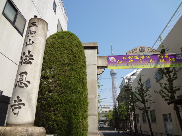 JR錦糸町駅の北側、蔵前通りを過ぎたところに、お寺の多く集まる一角があります。その中でも立派な山門が目に付くのが、報恩寺です。太田道灌が江戸城を建てるとき、丑寅の方角にある江戸平河に建立したことに始まるそうです。江戸開府は、何度か移転をかさせて、1688年現在の場所に至ったそうです。