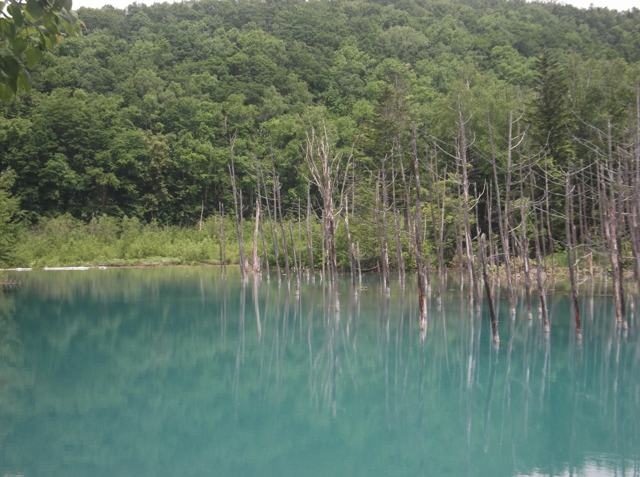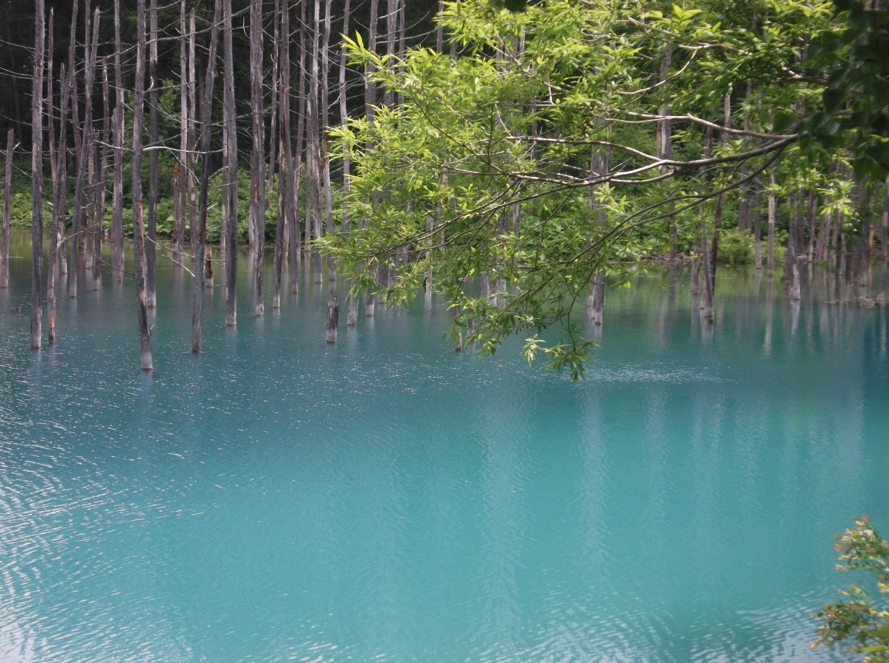 駐車場に車を止めて歩いて数分で青い池に到着。