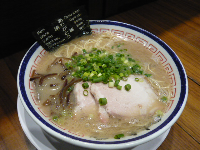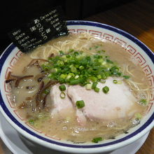 ダイバーシティ2階フードコートにあります。日曜日12時頃店舗前の席を確保。数名待ってラーメン820円を注文。麺の固さを聞かれ普通にしました。隣のカウンターで2,3分で出来上がり。極細麺に豚骨スープ、チャーシュー2枚、きくらげ、万能ねぎ、のり1枚にはありがとうと書かれてました。味は濃厚スープとおいしい麺の博多長浜らーめんです。